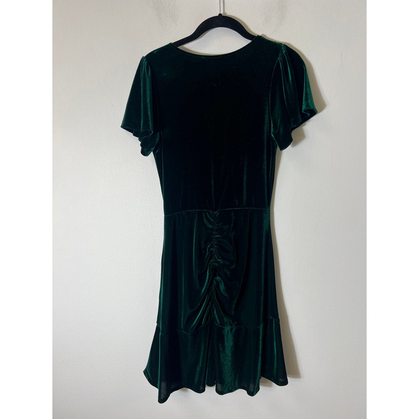 Holiday Dress. Scrunched Detail down the back. Pretty green velvet for holiday parties. Ruffle hem and hits about knee length.