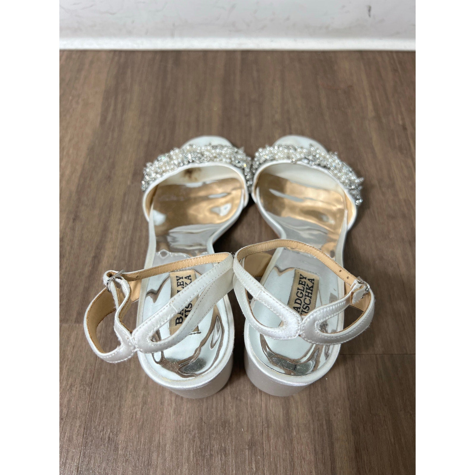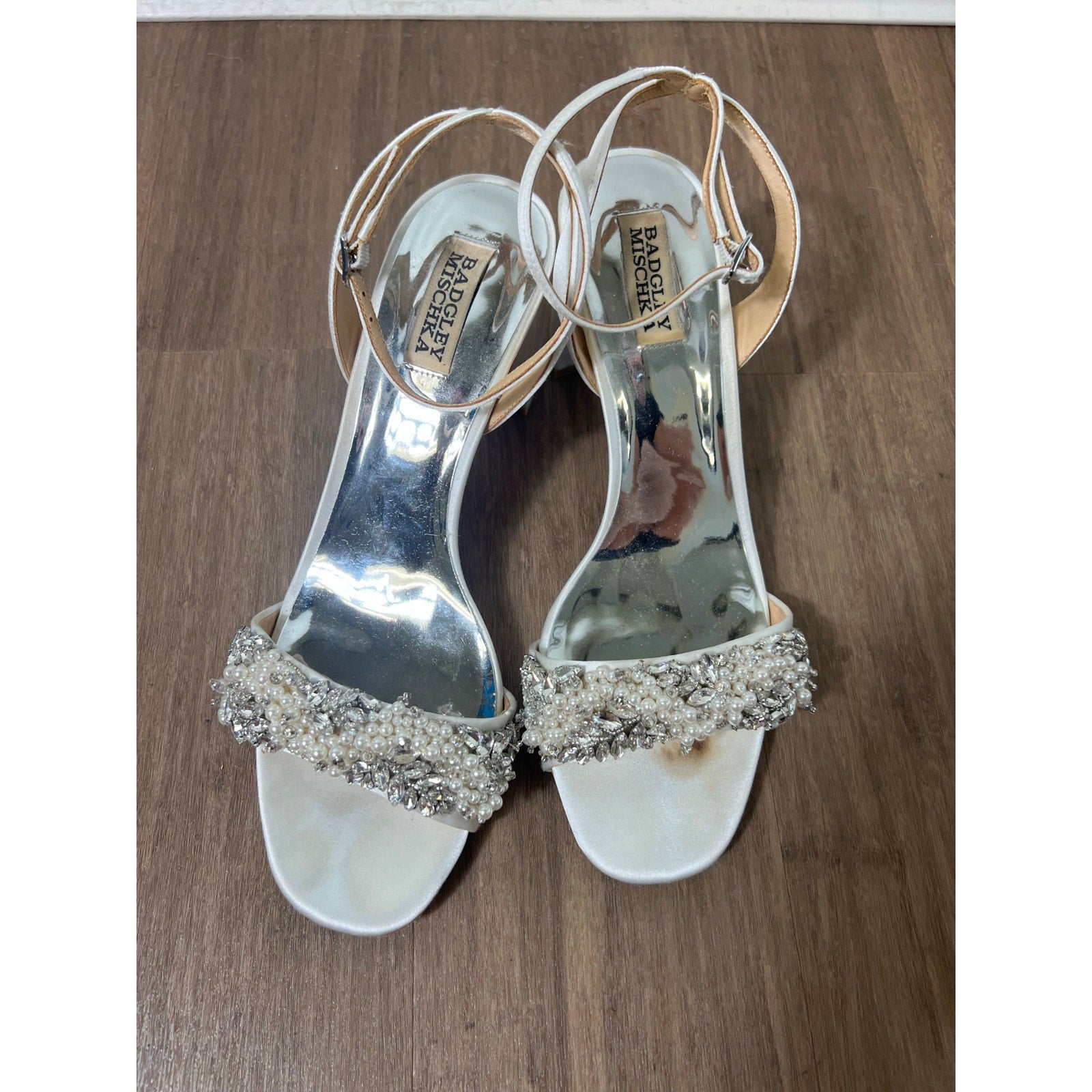 Excellent condition. Some wear on inside of shoe but body of shoe in perfect condition. Radiate elegance on your special day or next formal event with these exquisite Badgley Mischka Clara sandals! Perfect for a bride, bridesmaid, or any occasion that calls for sophisticated glamour.