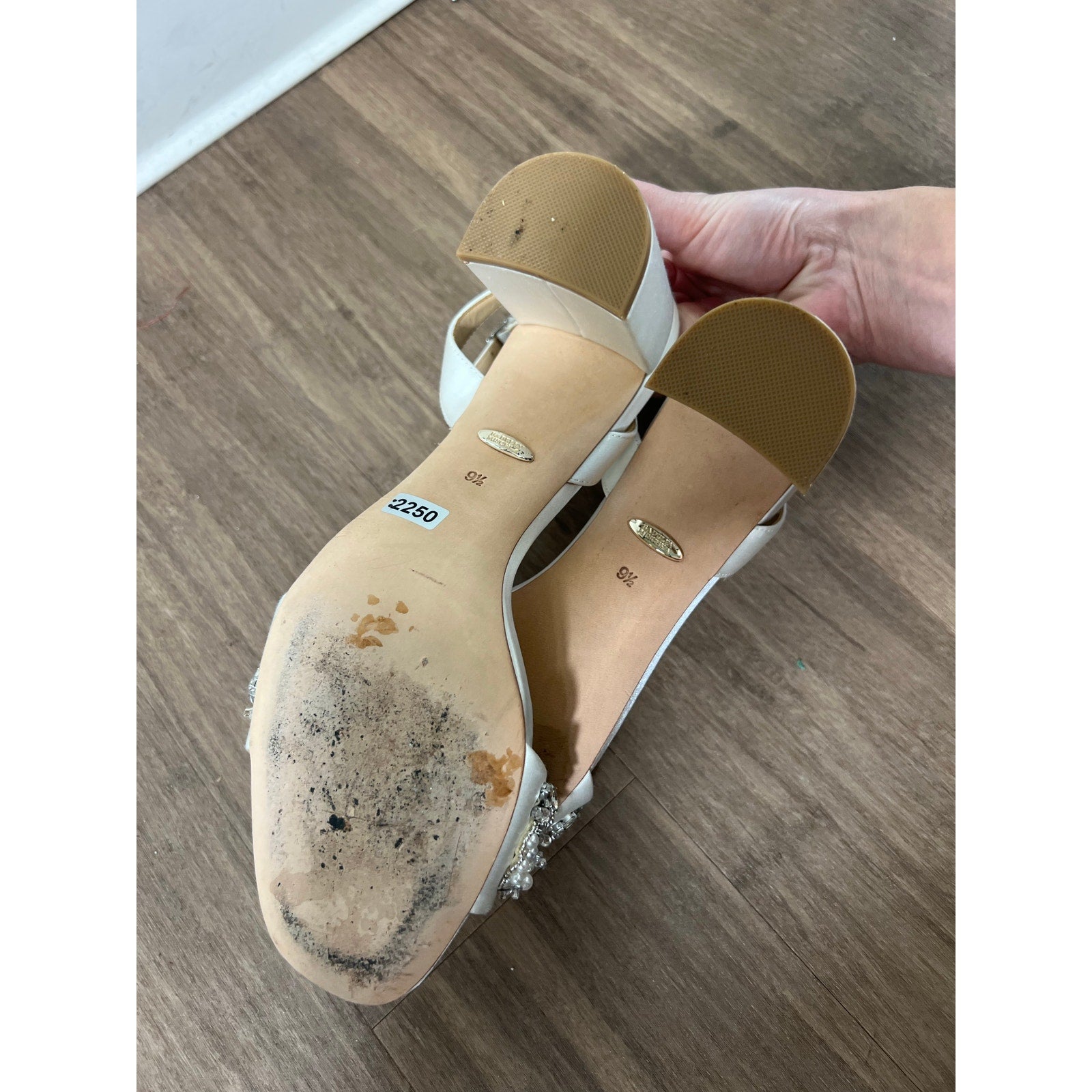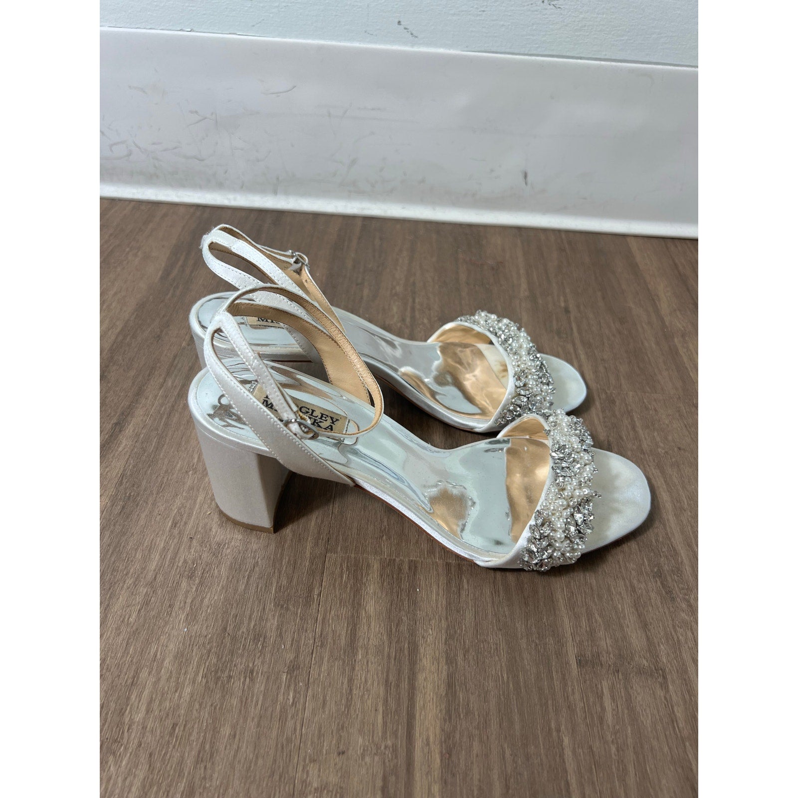 Badgely Mischika Clara White Satin Sandal With Pearl and Beading On Sandal Strap Sz 9.5