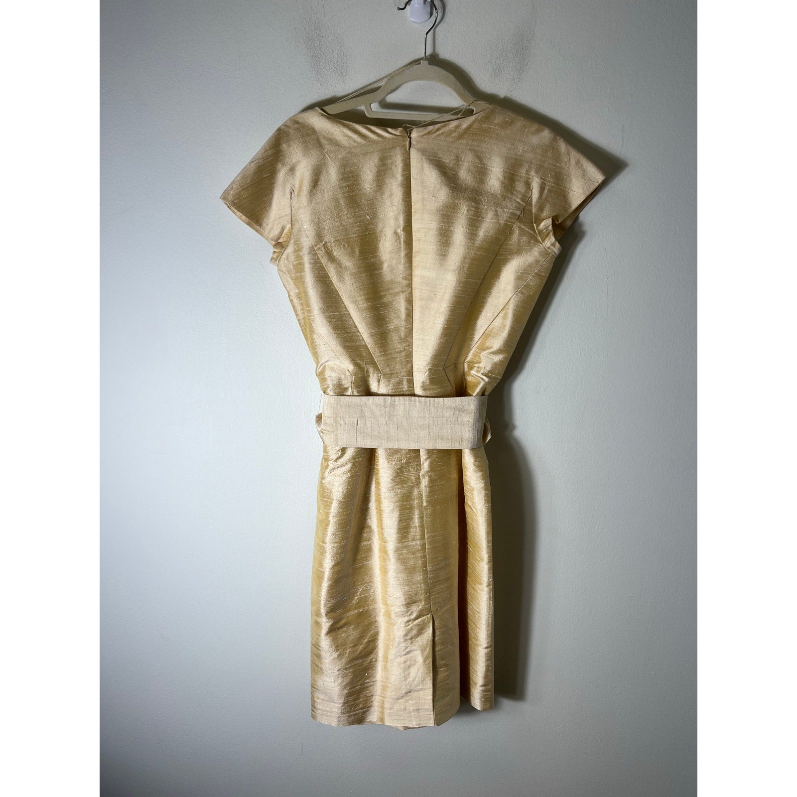 Good condition. Radiate sunshine in this beautiful butter yellow silk dress from Donna Morgan! Perfect for your next special occasion, this dress features a flattering V-neckline, delicate cap sleeves, and luxurious raw silk fabric. One untreated spot that sash does cover. Price reflects.