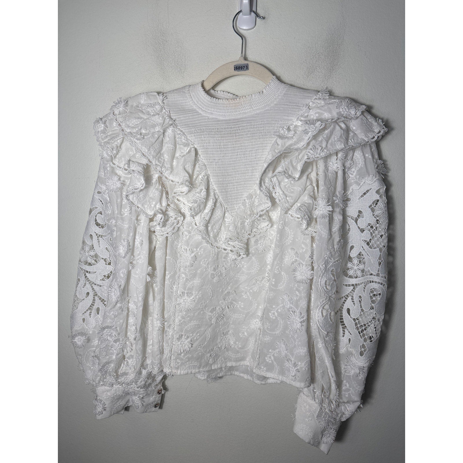 Farm Rio White Long Puff Sleeve Embroidered Shirt with Smocked Neck Sz XS