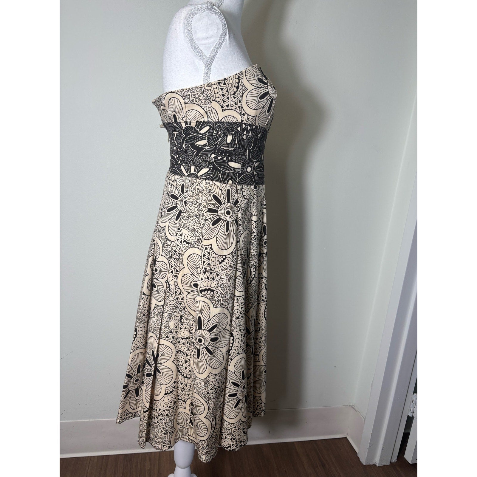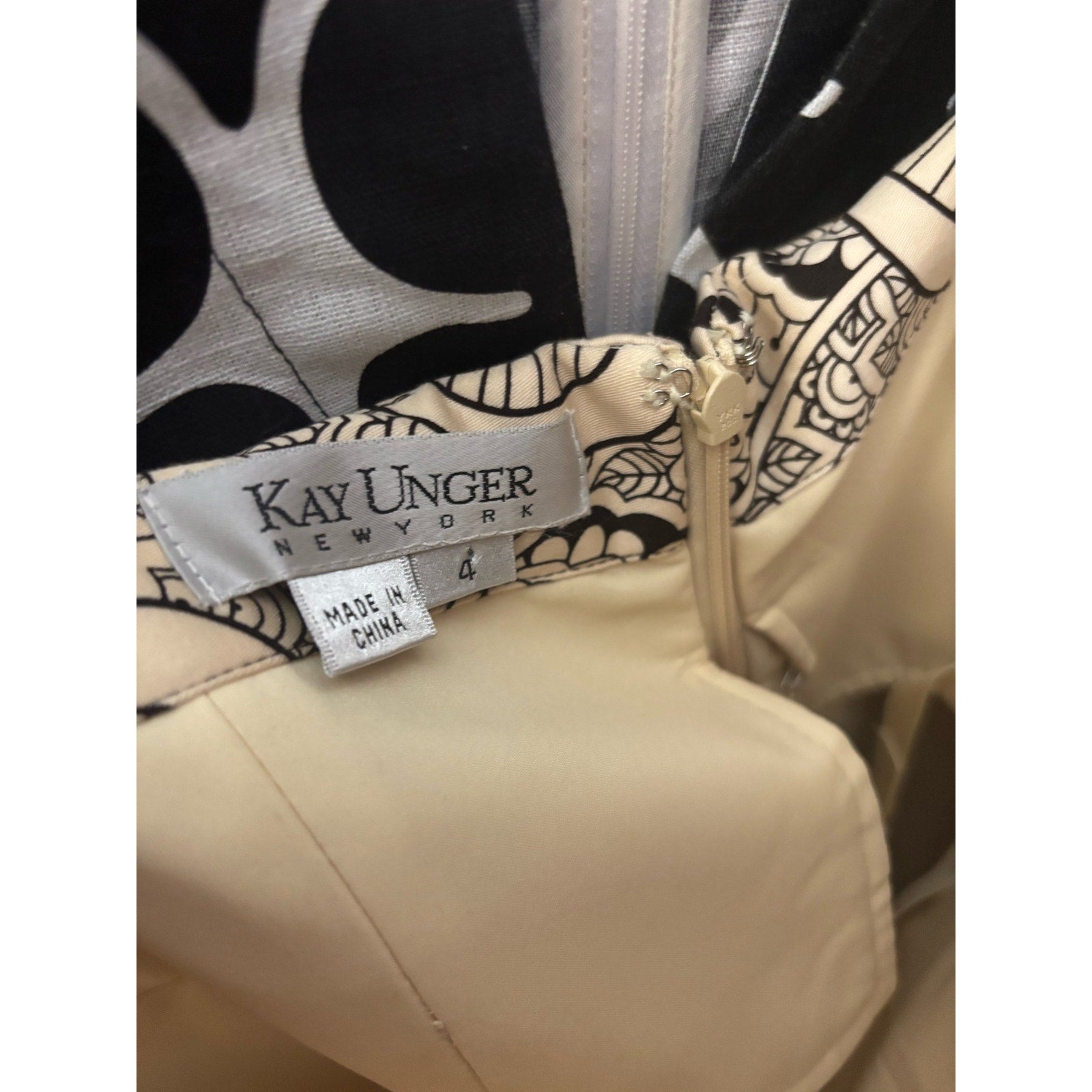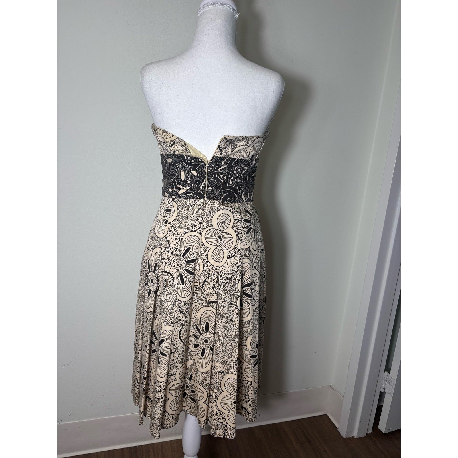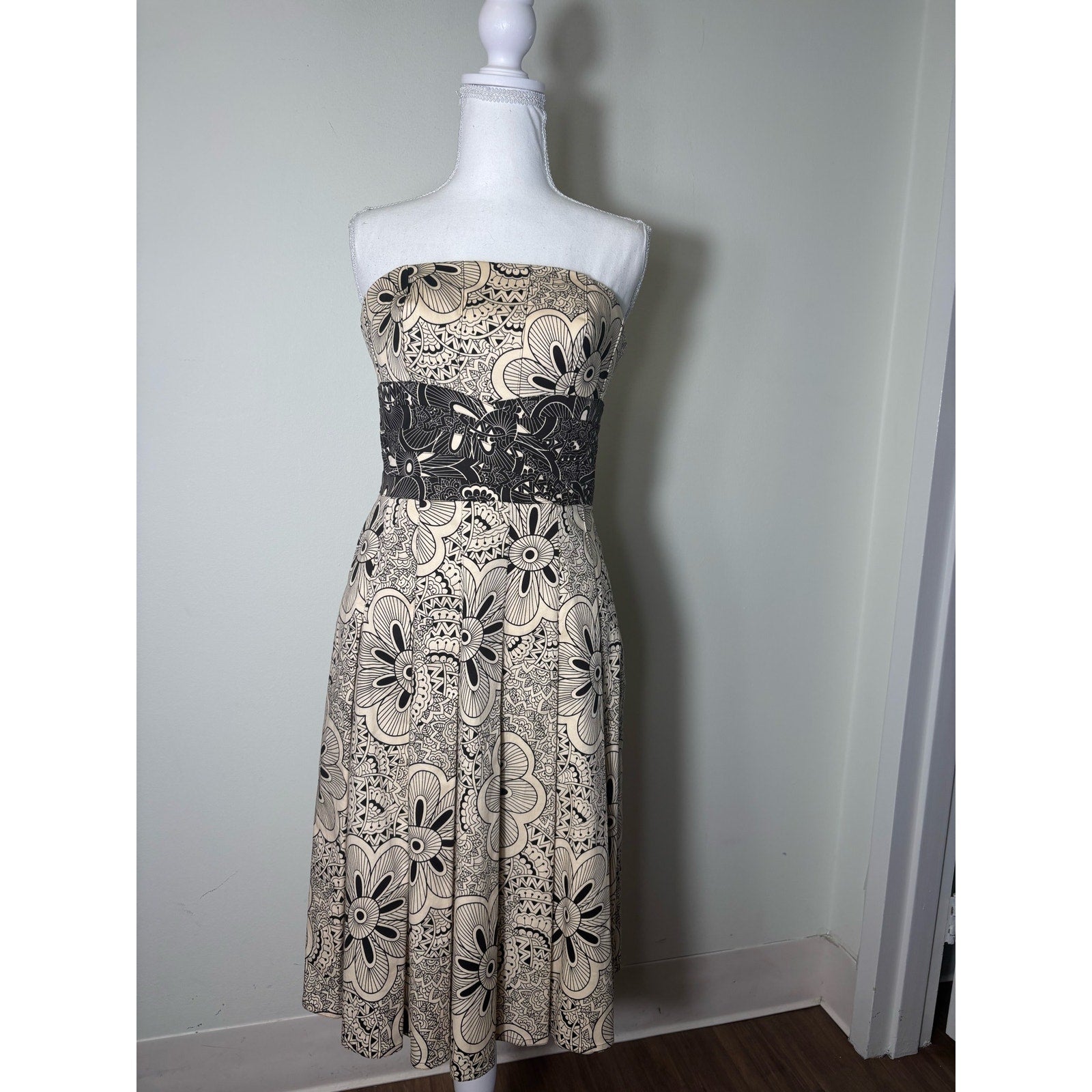 Kay Unger Off White and Black Print Strapless A Line Midi Dress Sz 4