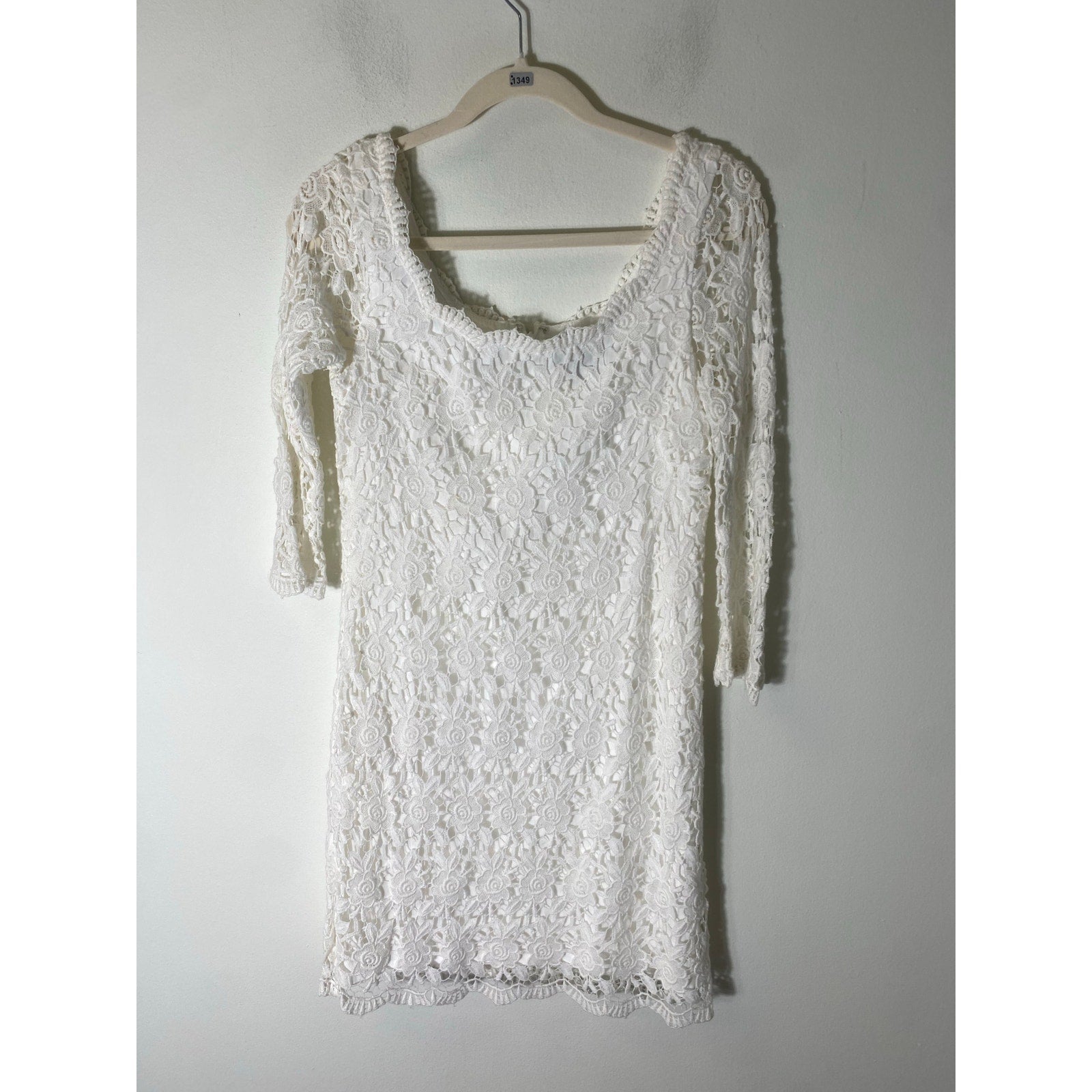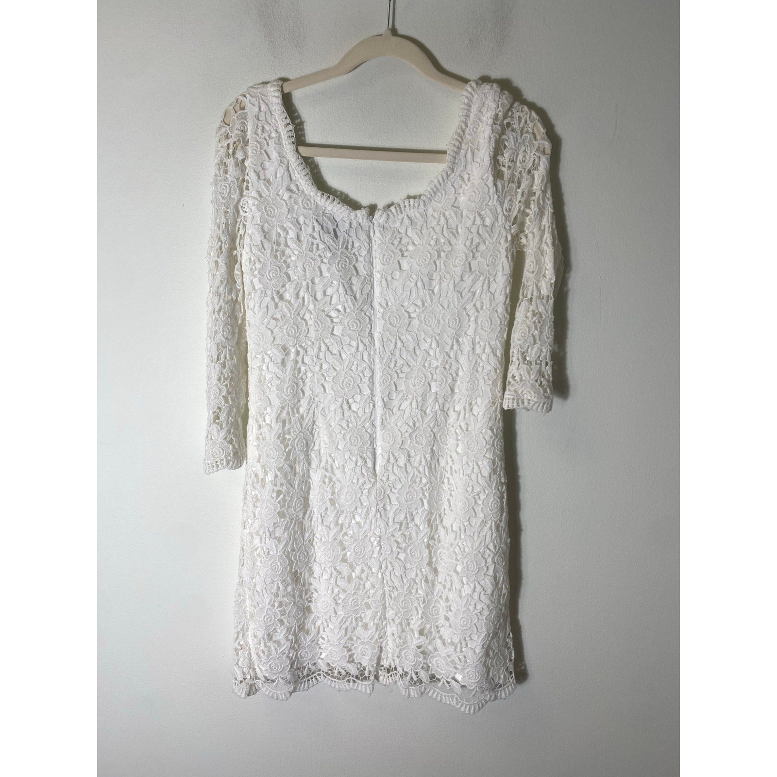 White Lace Overlay. Sleeves are Sheer. Very Pretty Dress. 2 Very Very Small Not Very Noticeable Yellow Marks. Most Likely Removeable with a Tide Pen. Price Reflects